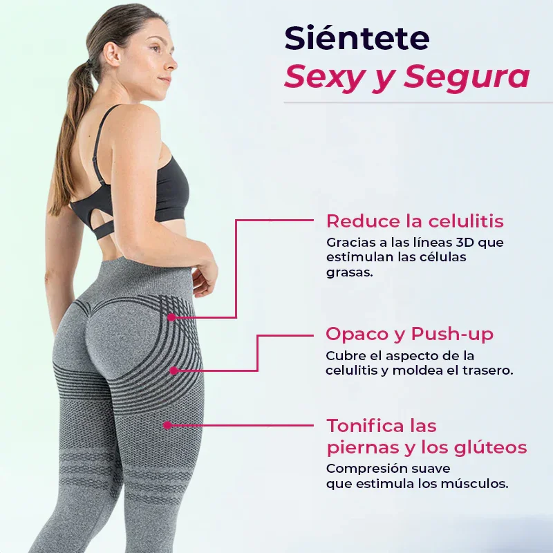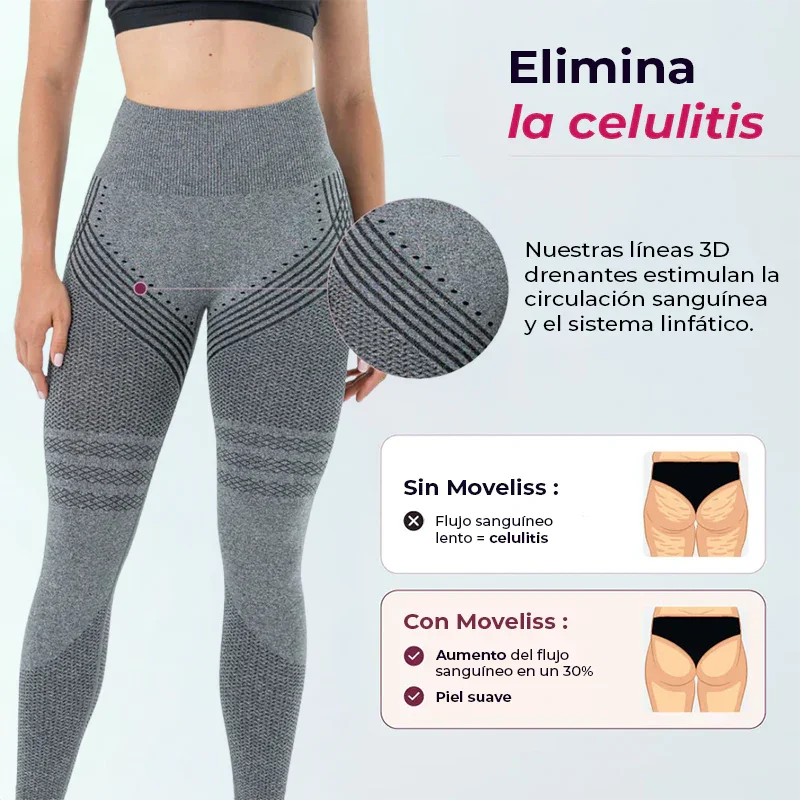 Los leggins Moveliss utilizan líneas 3D moldeadoras patentadas que aplican presión en las piernas y los glúteos.