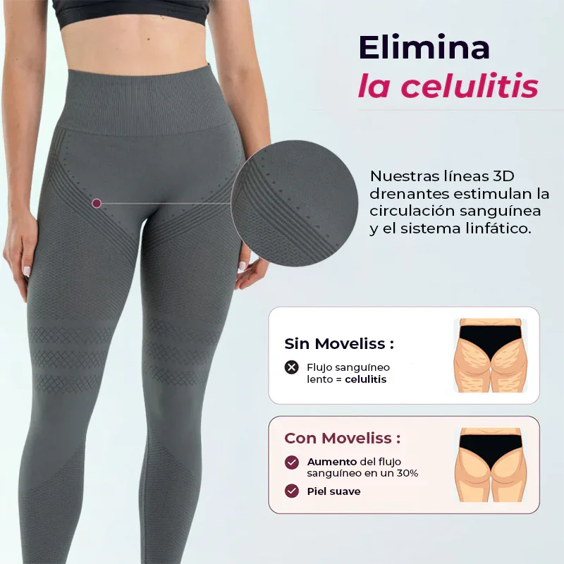 Los leggins Moveliss utilizan líneas 3D moldeadoras patentadas que aplican presión en las piernas y los glúteos.