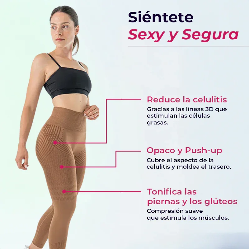 Nuestra tecnología de compresión 3D está inspirada en estudios científicos que demuestran que una compresión constante puede aumentar el flujo sanguíneo hasta en un 30%, activando los músculos y promoviendo la termogénesis. Esto ayuda a tu cuerpo a quemar grasa de manera más eficiente y a reducir visiblemente la celulitis con el tiempo, de forma natural y sin esfuerzo.