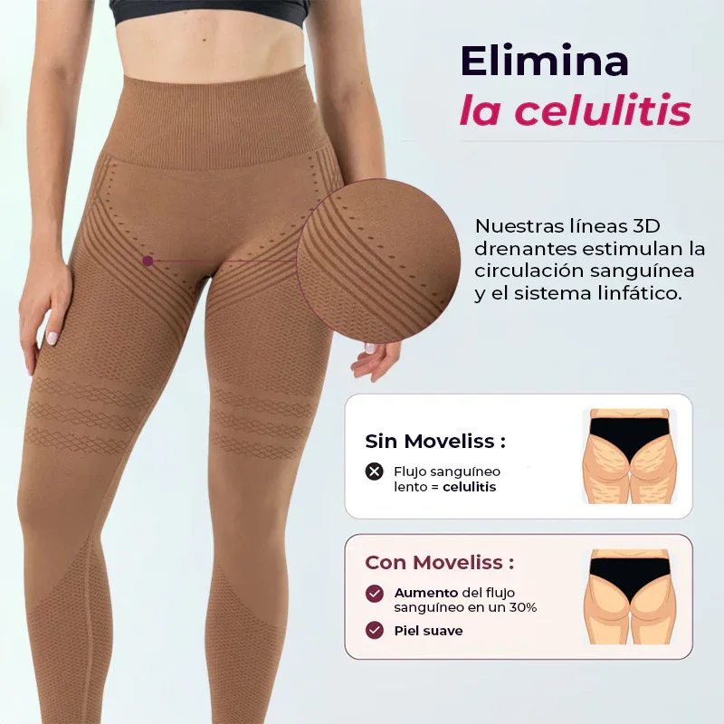 Los leggins Moveliss utilizan líneas 3D moldeadoras patentadas que aplican presión en las piernas y los glúteos.