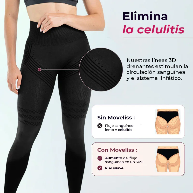 Los leggins Moveliss utilizan líneas 3D moldeadoras patentadas que aplican presión en las piernas y los glúteos.