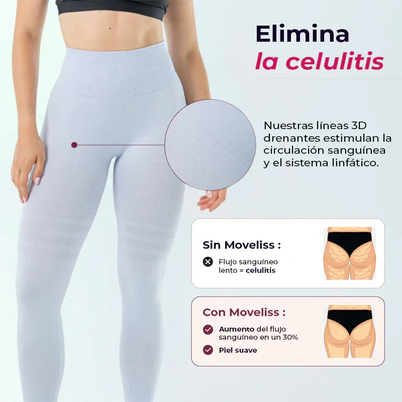 Los leggings Moveliss® incorporan la tecnología 3D, que utiliza líneas 3D para crear una estructura alrededor de los músculos y los glúteos. Esta estructura simula el flujo sanguíneo del cuerpo humano, promoviendo la circulación sanguínea y linfática.